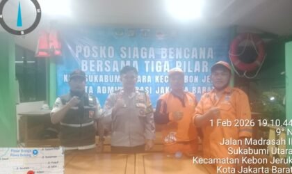 Untuk memastikan kesiapsiagaan menghadapi potensi bencana banjir, jajaran Polsek Kebon Jeruk bersama unsur Tiga Pilar melakukan koordinasi dan siaga di Posko Siaga Bencana Kelurahan Sukabumi Utara, Kecamatan Kebon Jeruk, Jakarta Barat, Minggu malam (1/2/2026).