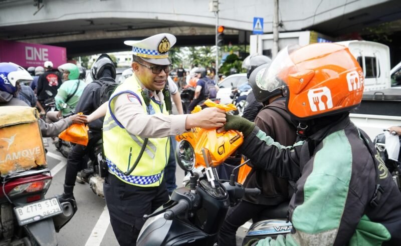 Jakarta Barat – Menjelang waktu berbuka puasa, personel Satuan Lalu Lintas Polres Metro Jakarta Barat bersama Brotherhood Birkers Community membagikan 5.000 paket takjil kepada para pengendara di Traffic Light Tomang, Jakarta Barat, Jumat (27/2/2026).