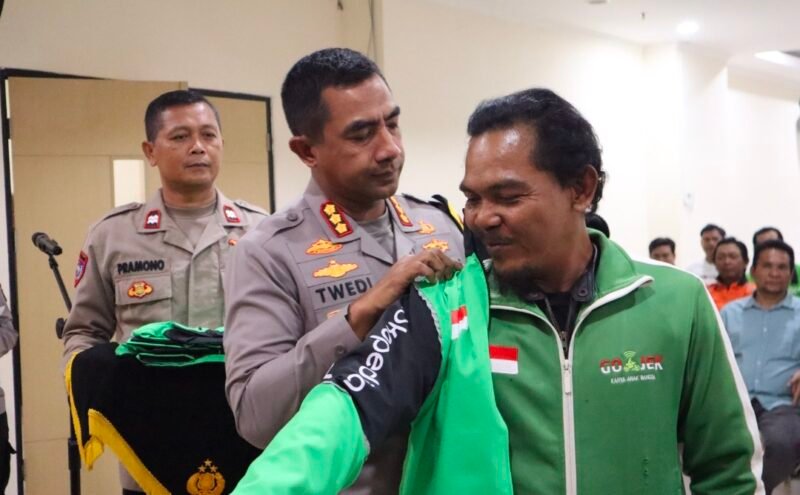 Selain pelantikan, para pengemudi ojol menerima jaket, stiker identitas, dan paket sembako sebagai bentuk perhatian dari kepolisian.