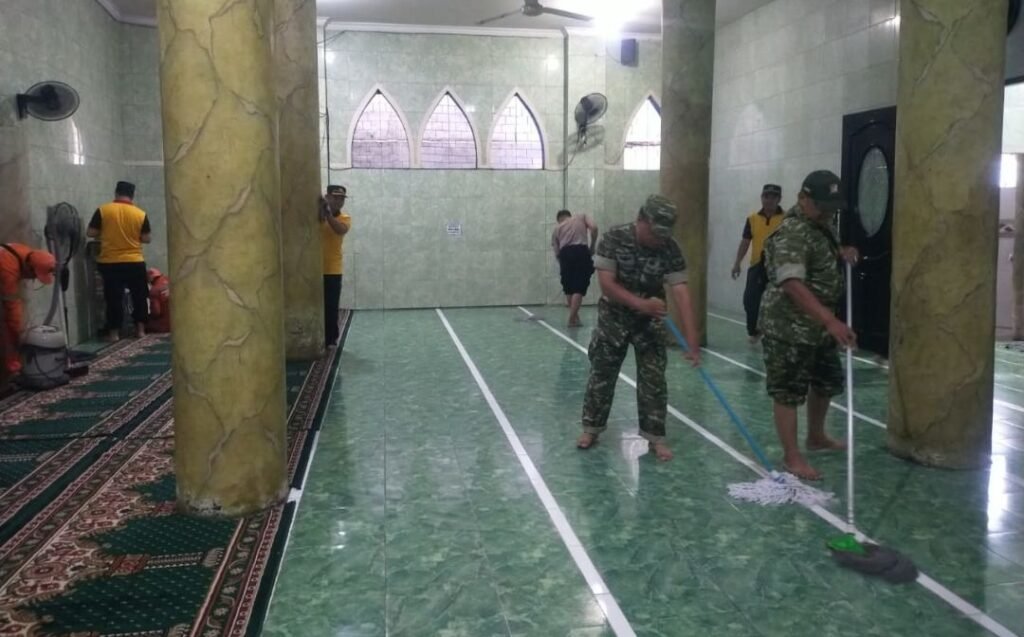 Gotong royong Polri, TNI, dan masyarakat membersihkan Masjid Al Muhajirin, wujud kepedulian untuk lingkungan yang bersih dan nyaman.