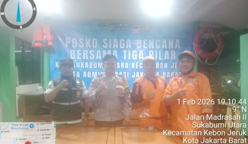 JAKARTA BARAT  – Untuk memastikan kesiapsiagaan menghadapi potensi bencana banjir, jajaran Polsek Kebon Jeruk bersama unsur Tiga Pilar melakukan koordinasi dan siaga di Posko Siaga Bencana Kelurahan Sukabumi Utara, Kecamatan Kebon Jeruk, Jakarta Barat, Minggu malam (1/2/2026).