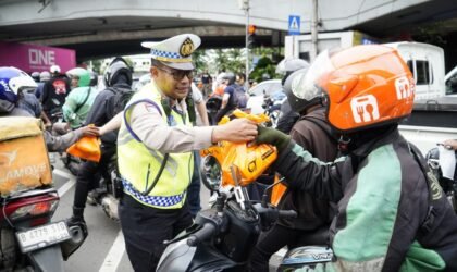 Menjelang waktu berbuka puasa, personel Satuan Lalu Lintas Polres Metro Jakarta Barat bersama Brotherhood Birkers Community membagikan 5.000 paket takjil kepada para pengendara di Traffic Light Tomang, Jakarta Barat, Jumat (28/2/2026).
