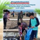 Mahasiswa STIK Lemdiklat Polri Angkatan 83 menggelar aksi bersih-bersih pantai bersama personel TNI dan warga di Kecamatan Seunuddon, Minggu (15/2/2026).